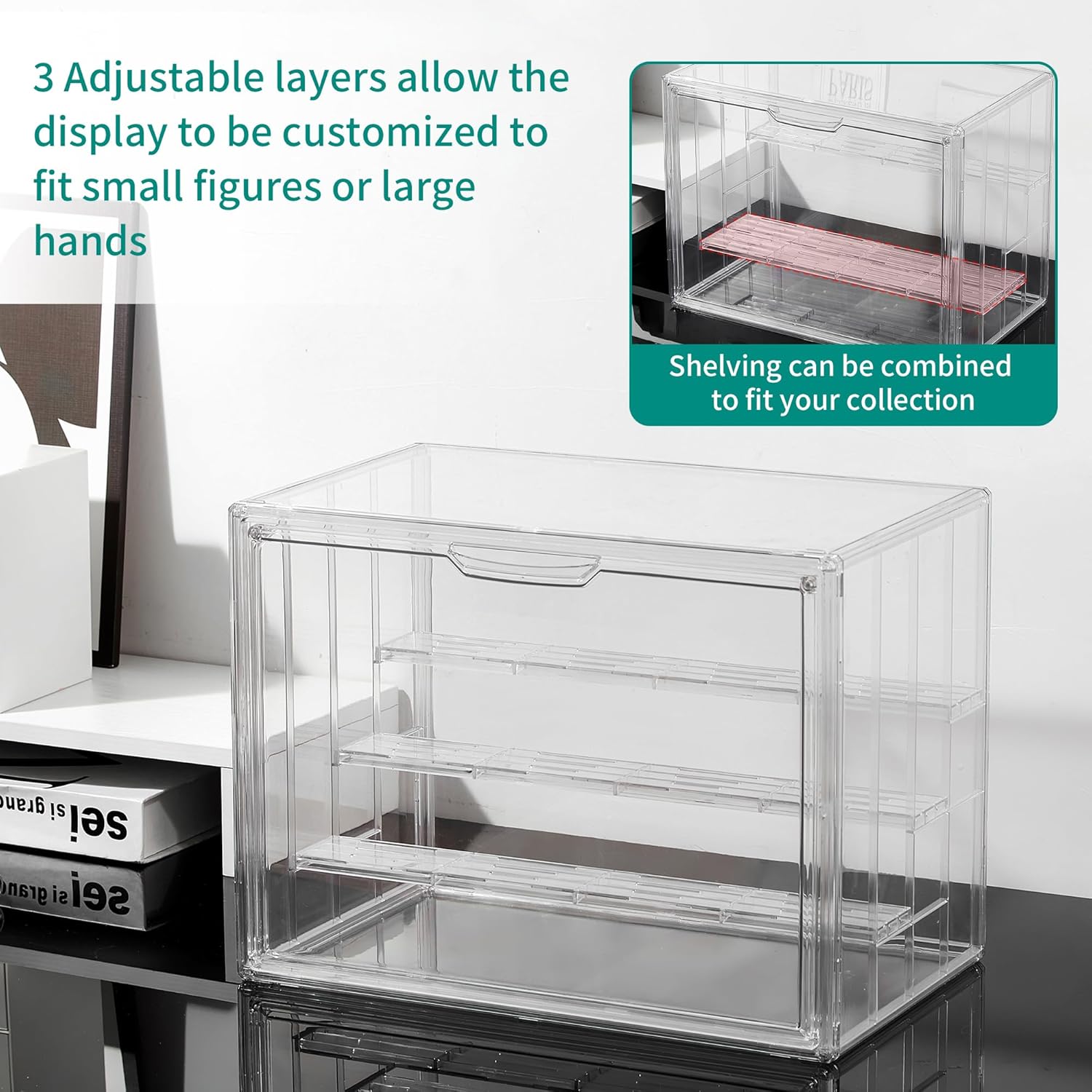 This is a two-pack set of clear acrylic display cases, perfect for showing off your collectibles and action figures. Each case has four tiers for storage and comes with three dividers you can move around to fit different-sized items. They’re designed to be stacked, and each case has a magnetic door to keep your treasures safe.