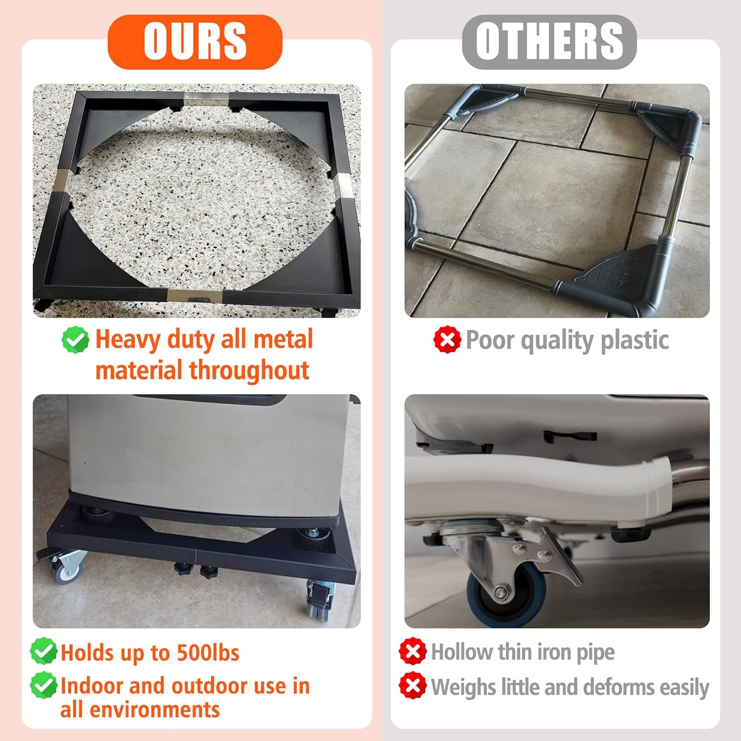 This image shows a versatile rolling base. It can be used for many things. You can put a dryer on it. A refrigerator can also sit on it. It works for electric smokers like Masterbuilt or Pit Boss. You can even put a cabinet on it. This base helps you move heavy items easily. It has wheels. The base is black. It is shown in different settings, like a laundry room, kitchen, and patio.