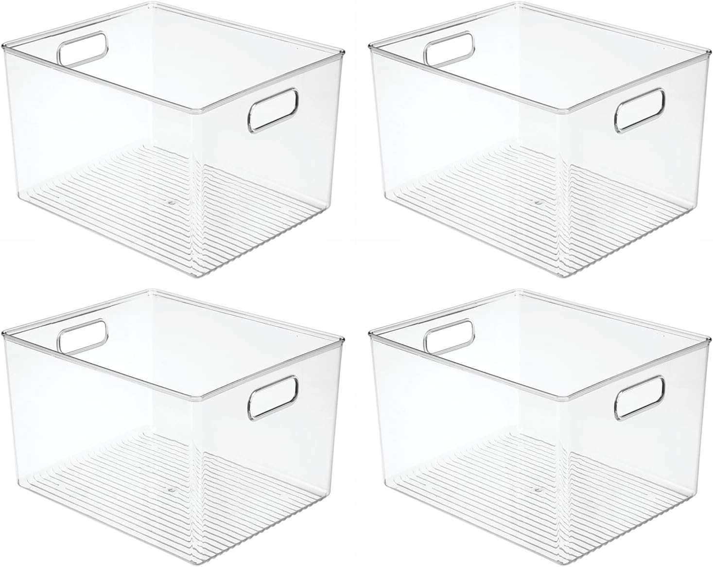 These clear plastic bins are perfect for organizing your kitchen. You get four durable containers that can hold food, drinks, or snacks. They fit almost anywhere, like your pantry, cabinets, countertops, fridge, or freezer, helping you keep things neat and easy to find.