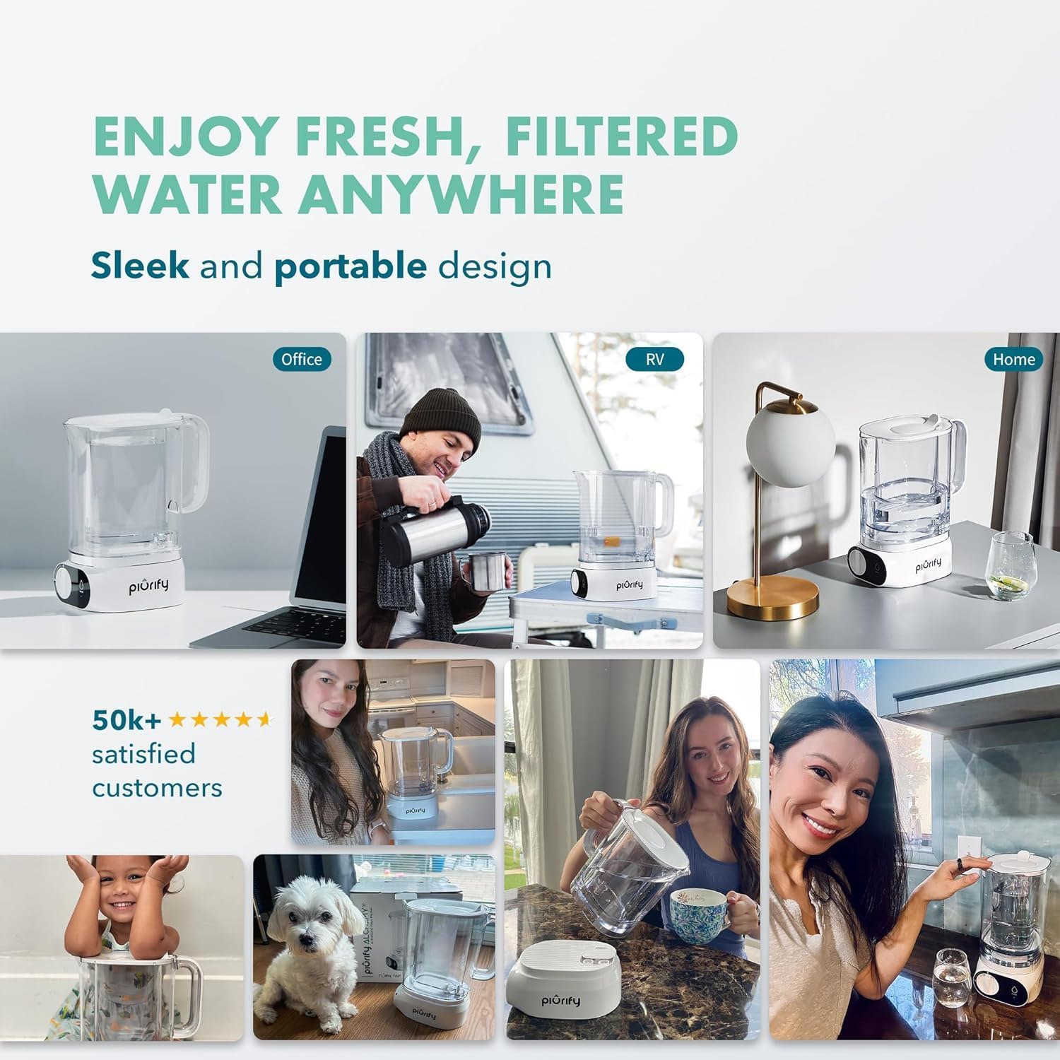 The PIURIFY Countertop Electric Water Filter Pitcher is a fast, efficient solution for clean drinking water. It uses advanced UltraFiltration technology to remove 99% of contaminants, including lead, PFAS, mercury, and chlorine, in just two minutes. The pitcher, made from BPA-free materials, has a 50-ounce capacity and a long-lasting filter that provides clean water for up to six months.