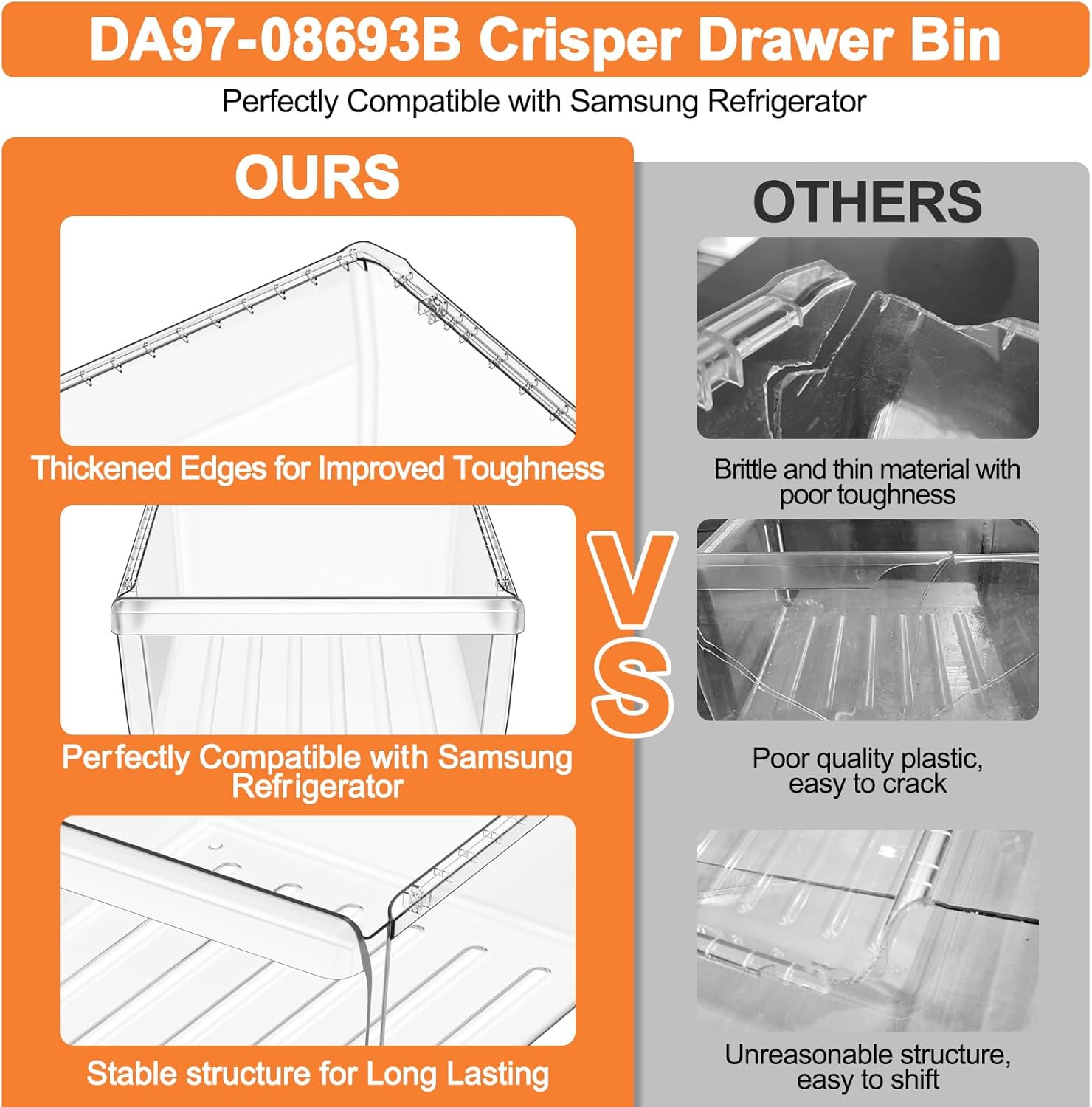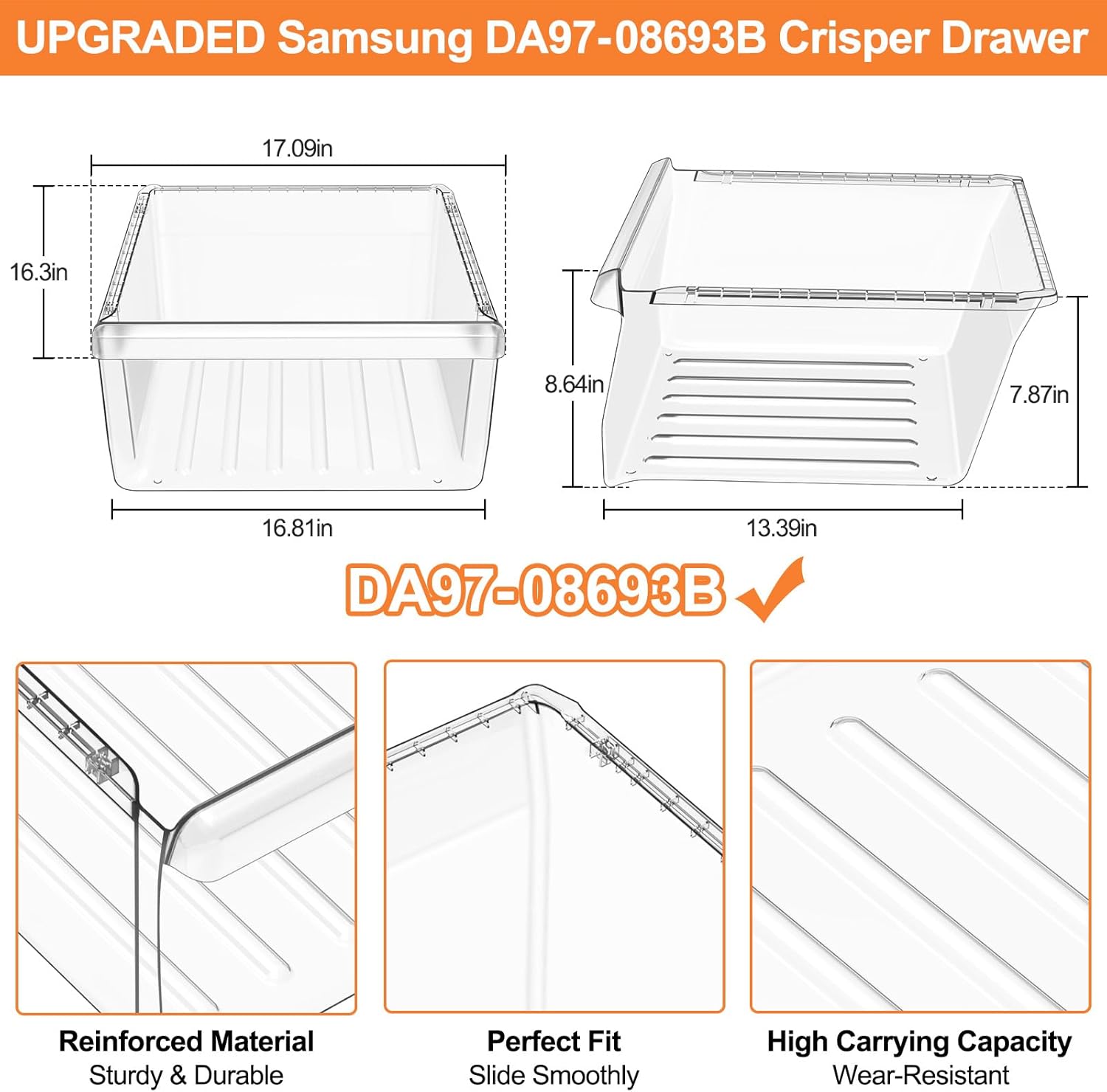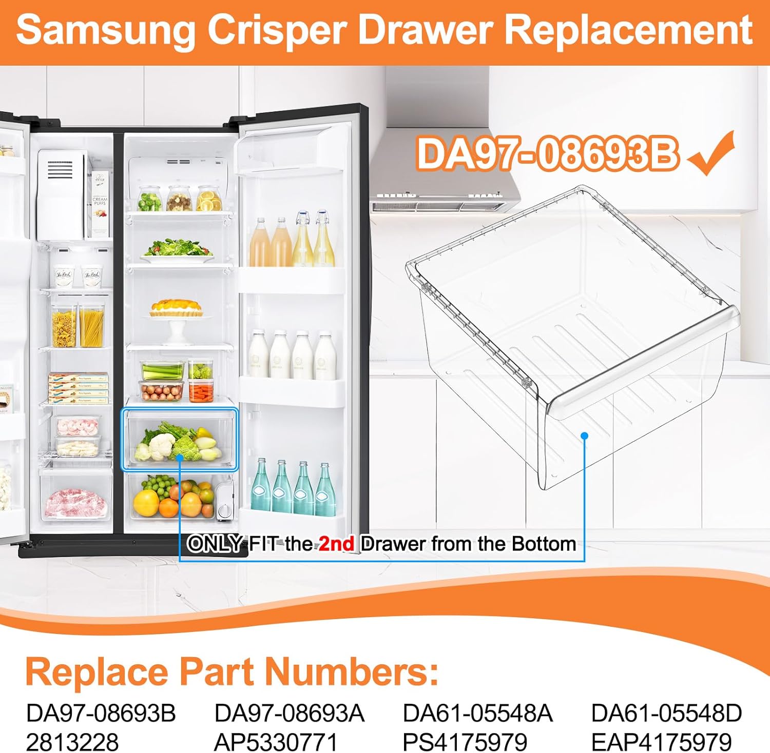 This is an upgraded crisper drawer made for Samsung refrigerators. It replaces several different part numbers, including DA97-08693B, DA97-08693A, and DA61-05548D. This drawer fits specific Samsung models like the RS25J500DSR, RS25H5000SR, and RS25J500DBC, and it’s designed to be the upper crisper bin in your fridge.