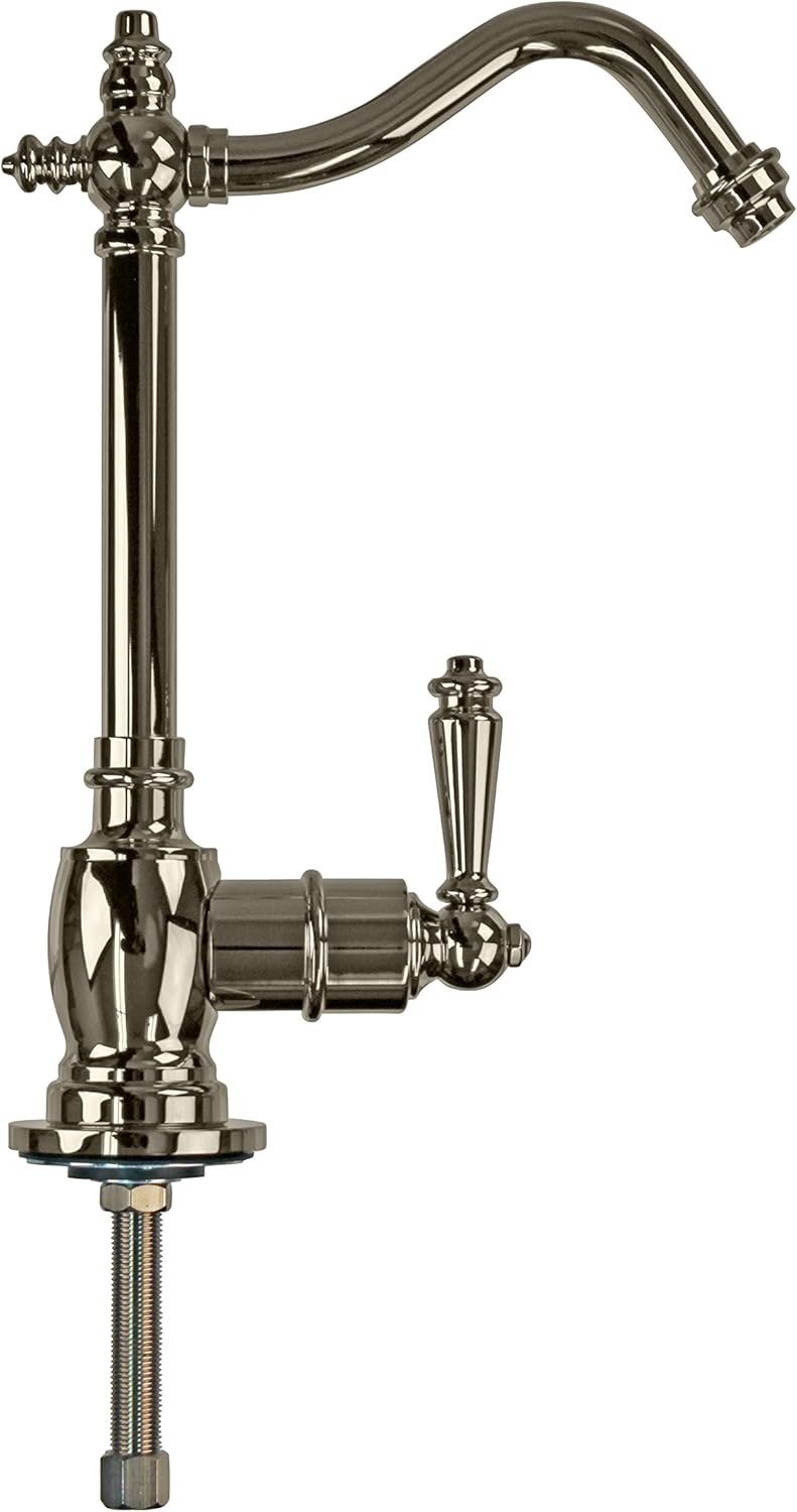 The Westbrass D2035-NL-05 Victorian cold water dispenser faucet has a 9-inch spout. It features a Victorian design and a single lever handle. Made from solid brass with a polished nickel finish, this faucet is durable and easy to install. It’s designed to dispense only cold water.