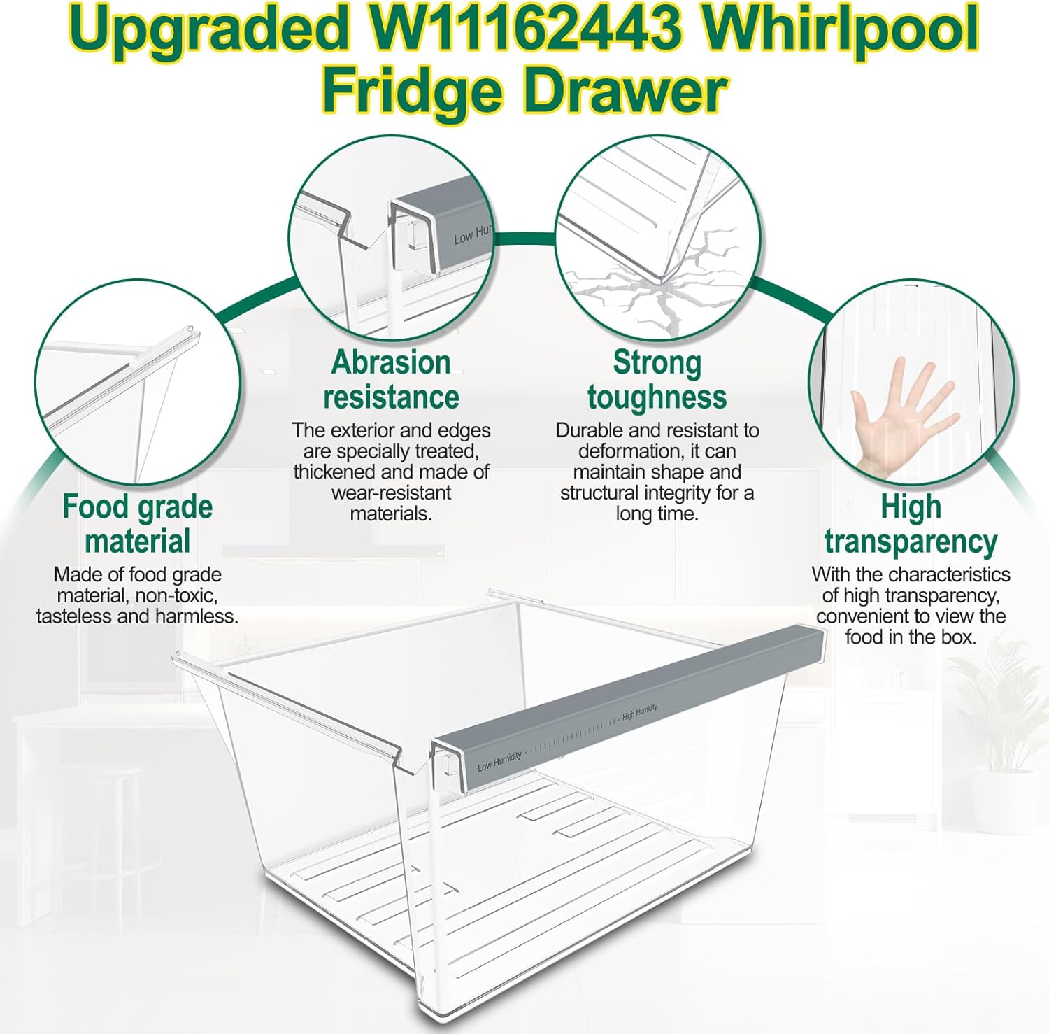 • ✅ [W11162443 Crisper Drawer Whirlpool Drawer Replacement] The whirlpool w11162443 refrigerator crisper drawer align perfectly with the refrigerator's tracks, ensuring smooth use. Durable materials and advanced technology,with sturdy enough to withstand daily use, excellent stability and load-bearing capacity.