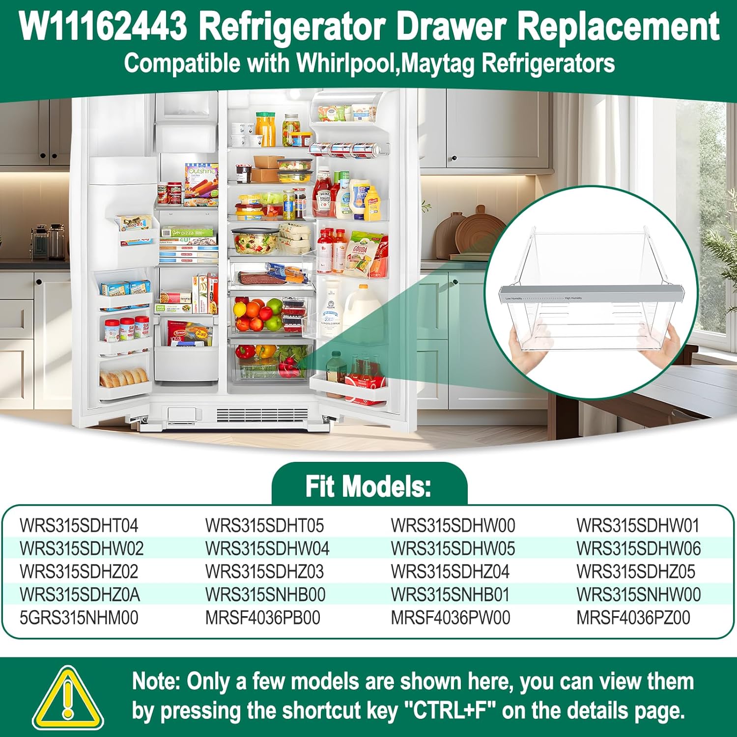 • ✅ 【Compatible】The W11162443 W11046494 Refrigerator Crisper Drawer compatible with Whirlpool, Maytag side-by-side Refrigerator.