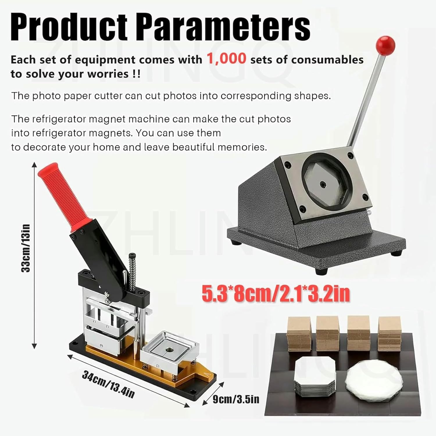 This is a photo magnet making machine that creates magnets measuring 53 x 80mm. It can also make buttons and is perfect for creating refrigerator magnets. The kit includes a cutter and over 1000 sets of consumables, along with cardboard magnets, so you have everything you need to start making magnets right away. It’s a complete and easy-to-use kit for making various types of magnets, including those for chips.