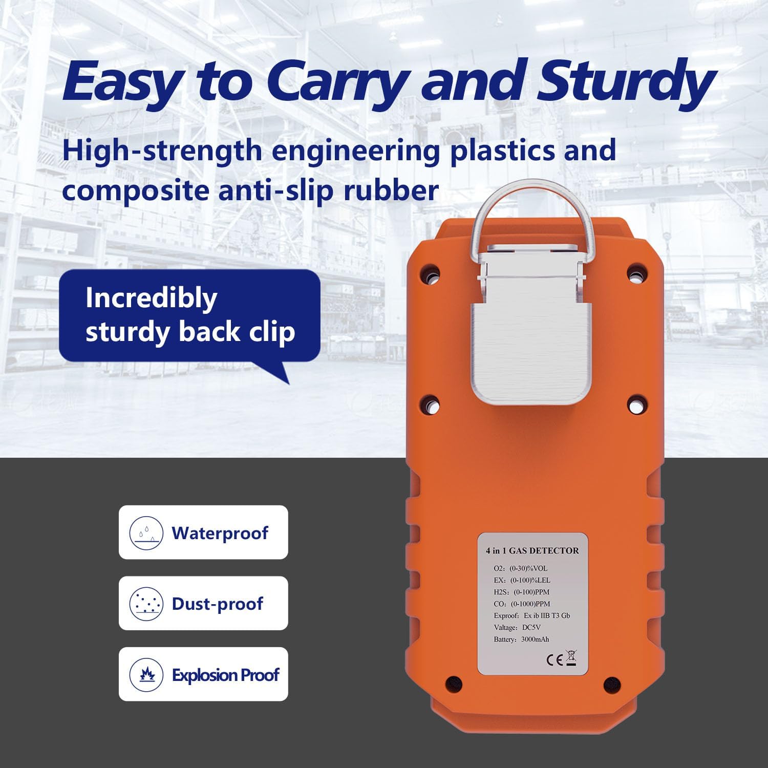 The ZKtesters 4 Gas Monitor is a portable device that can find four kinds of gases: carbon monoxide (CO), combustible gases (LEL), oxygen (O2), and hydrogen sulfide (H2S). It has a built-in pump to draw in air and can warn you about gas leaks with sound, flashing lights, and vibrations. This gas detector has a long-lasting battery and a clip, making it easy to carry around and use at work.